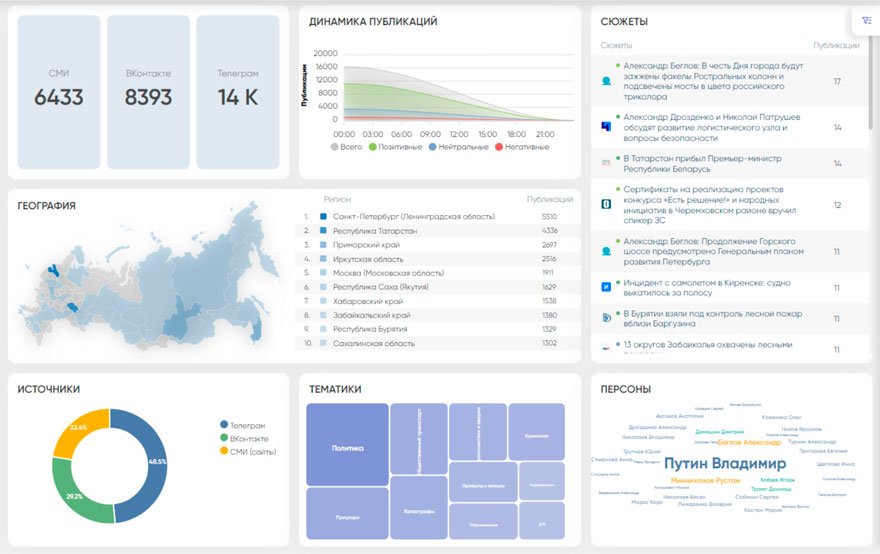 - Мониторинг: Отслеживает обсуждения вашей компании, продуктов, услуг, ключевых сотрудников и конкурентов в СМИ (сайты), Вконтакте и Телеграм.