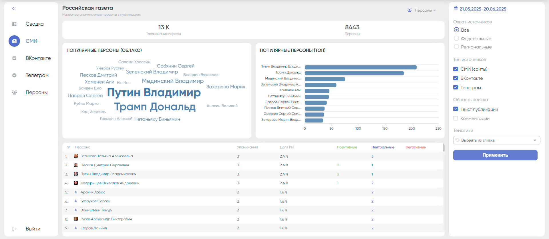 Отчёт «Персоны» выявляет ключевых фигур, наиболее часто упоминаемых в текущем СМИ (сайты) за анализируемый период.
