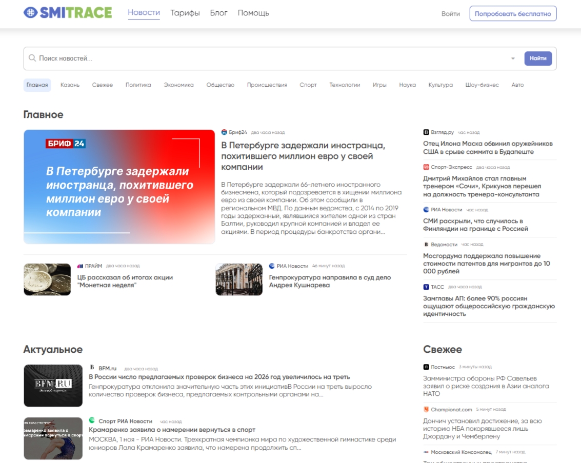 «Новости» в SMI Trace — это единая база всех публикаций из СМИ, ВКонтакте и Телеграм, которые мониторит наш сервис. Материалы автоматически группируются по сюжетам, что позволяет видеть, как развивается каждая тема в медиапространстве. Все публикации распределены по тематическим разделам: политика, экономика, общество, происшествия, спорт, технологии, игры, наука, культура, шоу-бизнес и авто. Отдельный раздел посвящен региональным источникам.