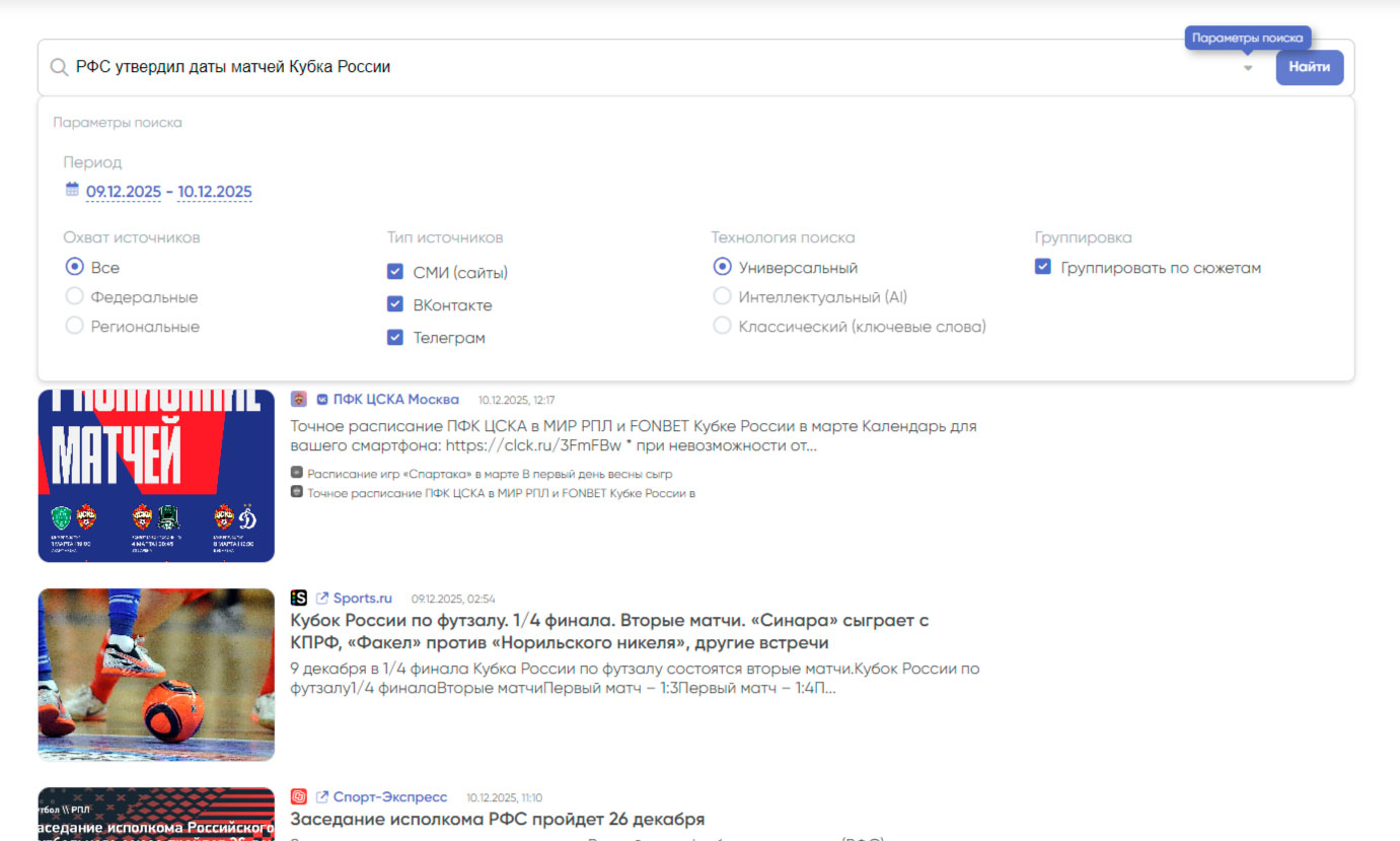 В агрегаторе новостей - «Новости» в SMI Trace реализован поиск не только по публикациям в СМИ (сайты), но также поиск по публикациям в ВКонтакте и Телеграм. Поиск может проходить в трех режимах: