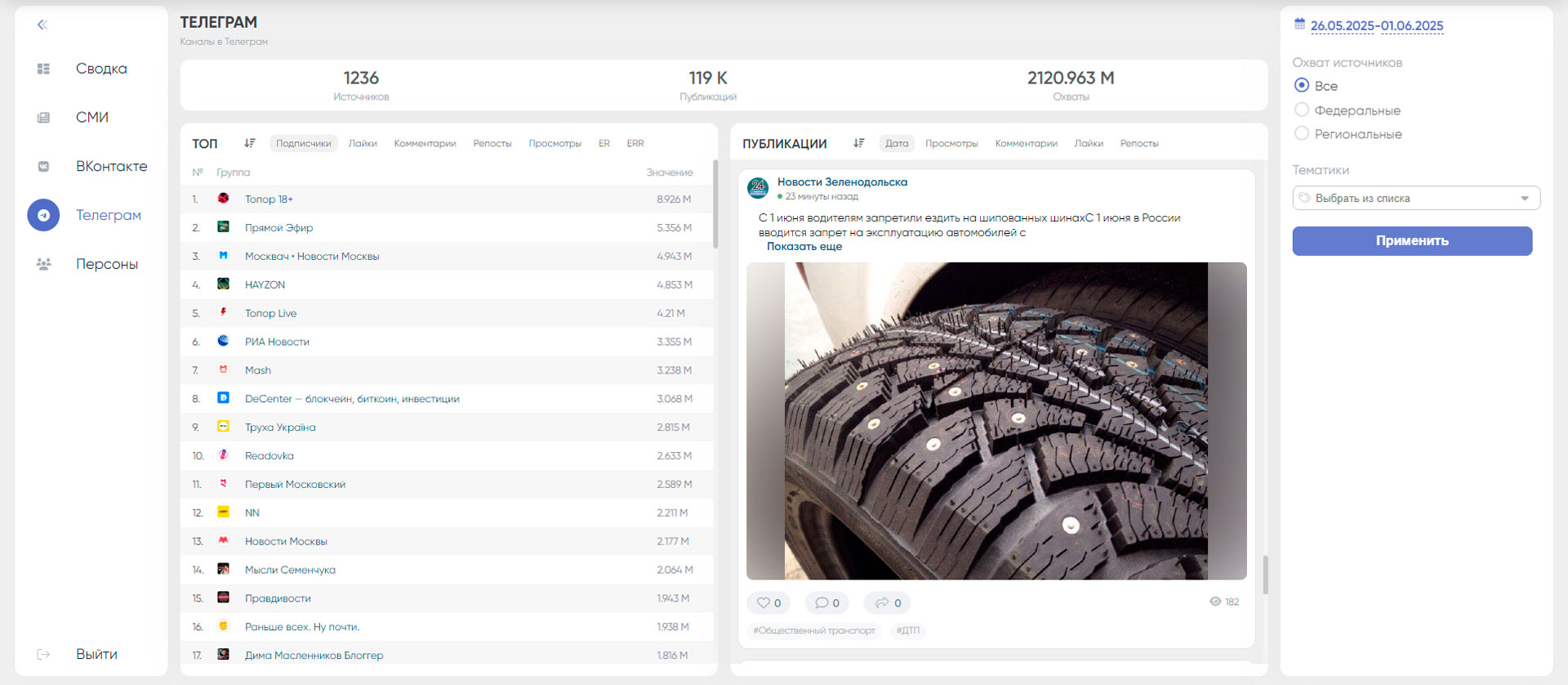 Раздел помогает определить рейтинг каналов Телеграм по различным показателям и отображает ленту публикаций.