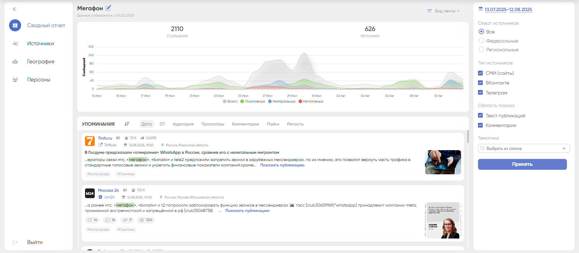 Сводный отчёт формирует обобщённую аналитику по всем упоминаниям темы в рамках заданного временного интервала.