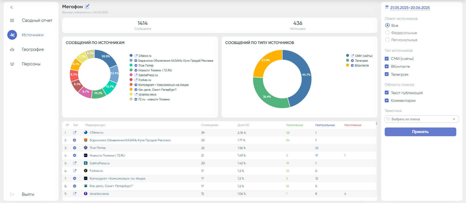 - Детальная таблица источников: Содержит сводные метрики по всем площадкам: количество сообщений, тональность.
