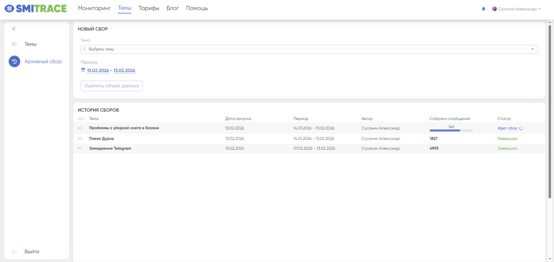 После создания темы доступен сбор истории сообщений за предыдущие дни - для этого используется раздел «Архивный сбор».