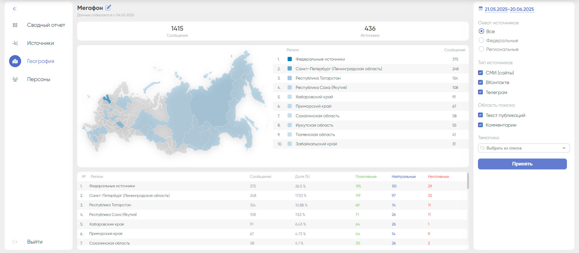 Отчёт «География» визуализирует региональное распределение упоминаний, определяя локацию источников через принадлежность их к какому либо региону.