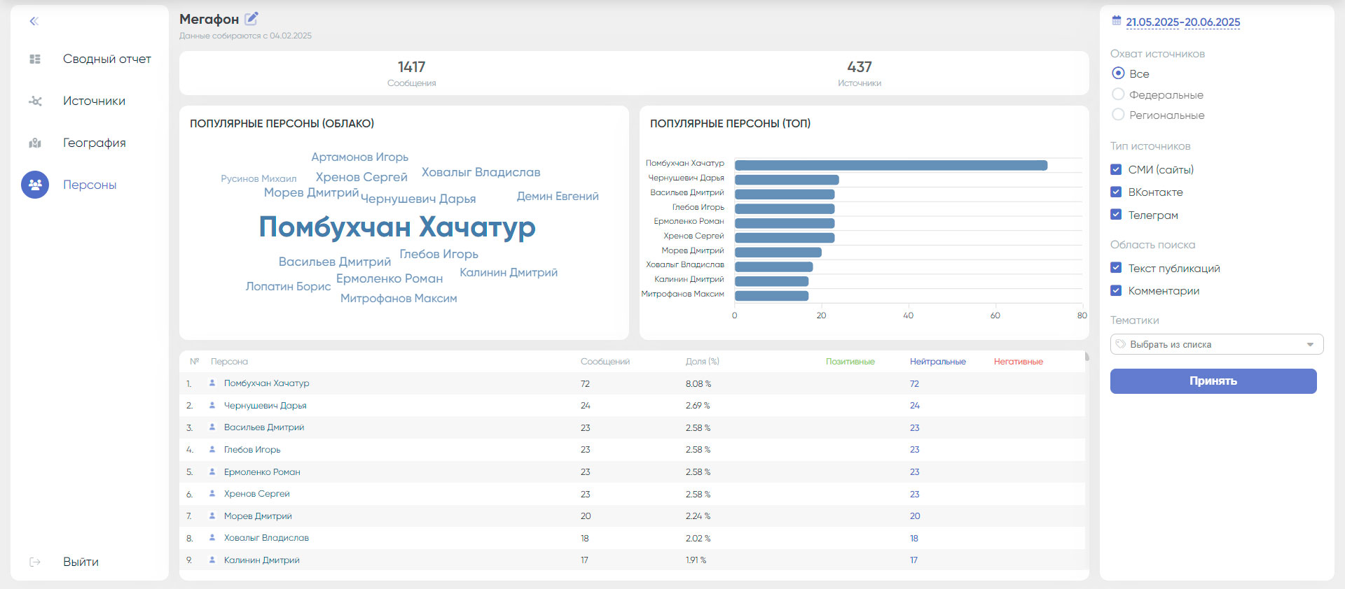 Отчёт «Персоны» выявляет ключевых фигур, наиболее часто упоминаемых в вашей теме за анализируемый период.