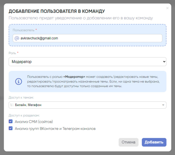 Для добавления пользователя в команду нажмите кнопку «Добавить пользователя», откроется соответствующее окно.