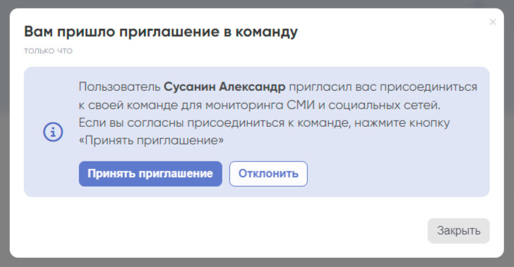 После добавления, пользователю придет уведомление о приглашении его в команду, он должен его принять, чтобы стать ее участником. После принятия приглашения пользователь отобразится в списке вашей команды.
