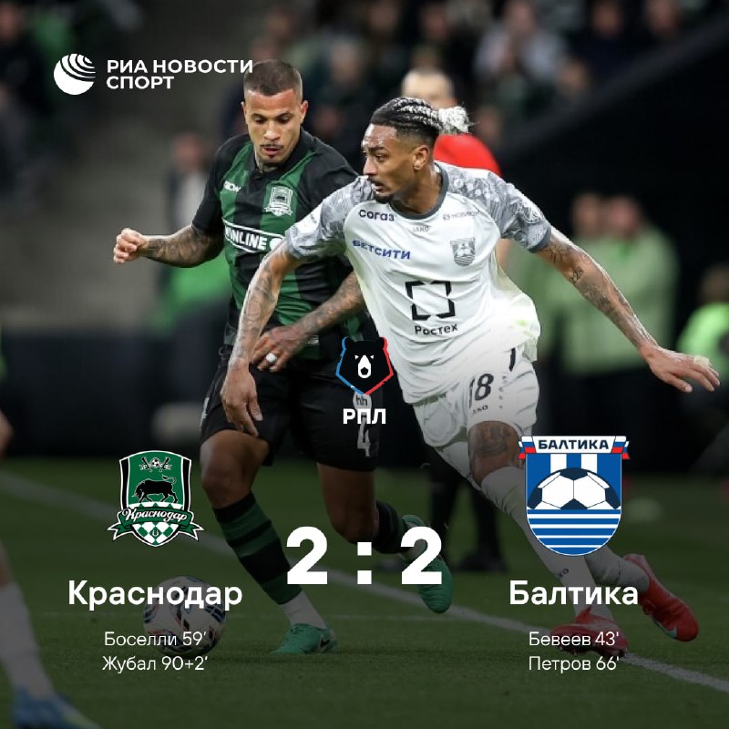 В матче 25-го тура РПЛ «Краснодар» сыграл вничью с «Балтикой» со счетом 2:2, пропустив вперед в конце матча, но сравняв счет в добавленное время. Эта ничья позволила «Зениту» опередить «Краснодар» на одно очко в турнирной таблице.