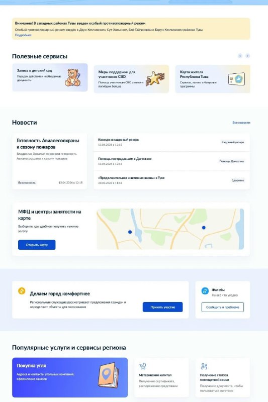 На портале «Госуслуги» запущен региональный раздел «Республики Тыва», обеспечивающий быстрый доступ к ключевым электронным услугам региона, экономия времени пользователей и предоставление актуальной информации.