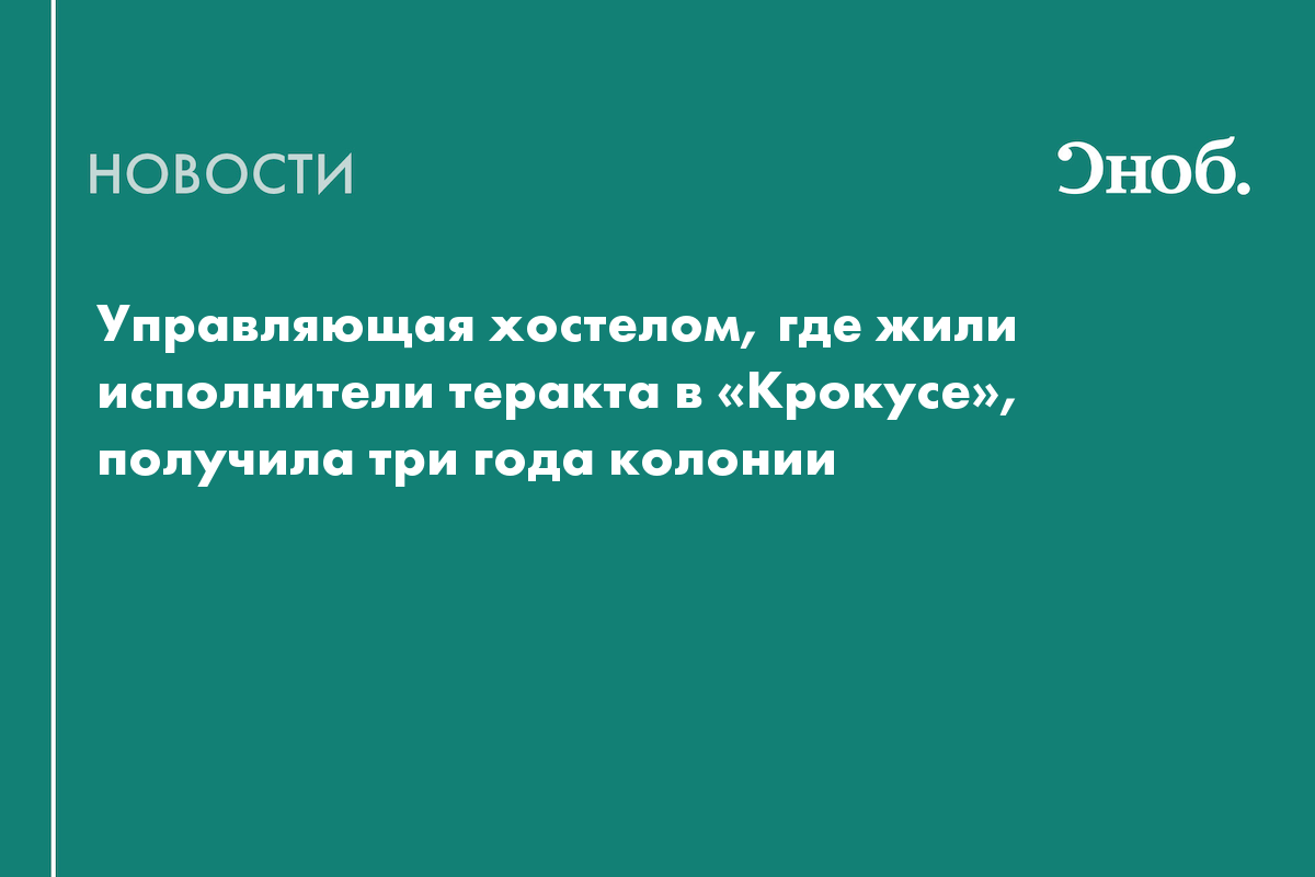 Управляющая хостелом, где незаконно жили исполнители теракта в "Крокус Сити Холле", получила три года лишения свободы за нарушение миграционного законодательства. Женщина управляла небольшим апарт-отелем, в котором некоторое время жили двое из четырех исполнителей теракта.